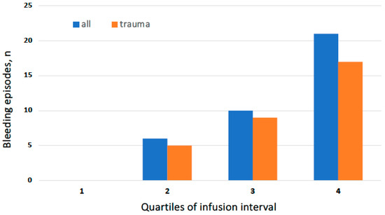 Distribution of numbers of all-type (blue columns) and traumatic (orange columns) bleeding episodes during rIX-FP prophylaxis according to the quartiles of the infusion interval. Two episodes occurring over the prescribed interval (2 and 3 days, respectively) are included in the last (4) quartile.