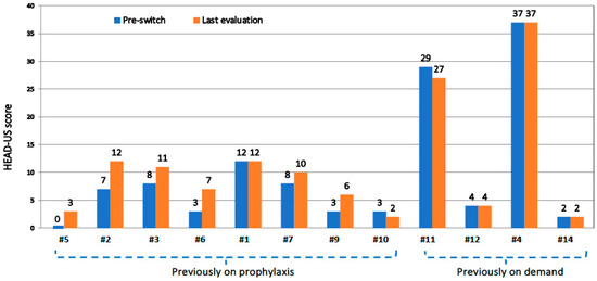 Comparison of HEAD-US scores in 12 patients over the study period, before switching to rIX-FP (blue columns) and at last assessment on rIX-FP prophylaxis (orange columns). Patients are grouped according to the previous treatment regimen (prophylaxis and on demand).