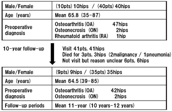 Nine patients (nine hips) were lost before their 10-year follow-up. One patient (one hip) died of pneumonia after 6 years. Two patients (two hips) died of cancer after 4 and 9.5 years, respectively. However, a final follow-up was performed on three patients. Therefore, these patients were included in the present study. Another six patients (six hips) did not visit before their 10-year follow-up for unclear reasons. After excluding the six patients who were lost to follow-up, 44 patients (44 hips; 9 men and 35 women; mean age, 64.5 (39–85) years) were evaluated at a mean 11-year follow-up (10–12 years). Patient demographics are shown in Figure 1. Primary THA was indicated for primary hip osteoarthritis (OA) in 95.5% (42/44) of patients. The other two patients were diagnosed with avascular necrosis of the femoral head.