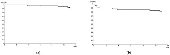 The overall implant survival rates at 10 and 12 years were 93.0% and 75.9%, respectively (Figure 2a). The rates of survivorship of revision and loss of follow-up at 10 and 12 years were 83.9% and 66.8%, respectively (Figure 2b).