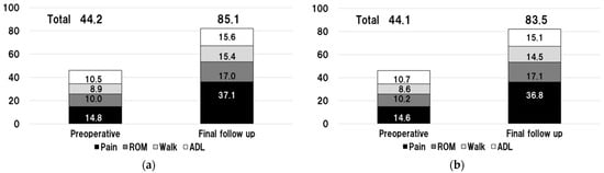 Clinical hip function outcomes using the Japanese Orthopedic Association (JOA) hip score preoperatively and at the final follow-up. (a) In 36 patients (36 hips), 8 hip revisions were excluded due to infection after primary arthroplasty. (b) In 44 patients (44 hips), 8 hip revisions were performed.