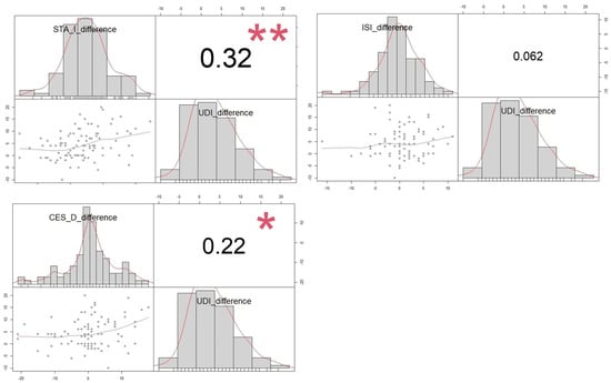 Correlation between changes in UDI 6 questionnaire and improvement in depression, anxiety, and insomnia symptoms after successful POP surgery. Correlation between ISI, STAI, CESD, and UDI-6 improvement after pelvic floor surgery is shown via a scatterplot, with each pair’s distribution, correlation coefficient, and significance levels marked (* p < 0.05, ** p < 0.01).