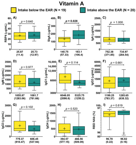 Antibody concentration according to the dietary intake of vitamin A of COVID-19 outpatients. RBP4 levels in patients with either dietary intake below or above the EAR (A). The levels of the different antibody isotypes and RBD NAb in patients according to the classification of vitamin A intake (B–I). The description for each graph includes the median with the interquartile range, Mann–Whitney U test. Bold formatting is used to highlight significant p-values. Abbreviations: EAR, estimated average requirement; RBP4, retinol-binding protein 4; Ig, immunoglobulin; RBD NAb, receptor-binding domain neutralizing antibodies; hs-CRP, high-sensitivity C-reactive protein; IL-6, interleukin 6; TGF-β1, transforming growth factor beta 1.