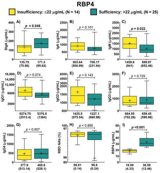Antibody concentration according to RBP4 classification of COVID-19 outpatients. The levels of the different antibody isotypes and RBD NAb in patients according to the classification of RBP4 concentration (A–H). RBP4 levels in patients with either RBP4 insufficiency or sufficiency (I). The description for each graph includes the median with the interquartile range, Mann–Whitney U test. Bold formatting is used to highlight significant p-values. Abbreviations: RBP4, retinol-binding protein 4; Ig, immunoglobulin; RBD NAb, receptor-binding domain neutralizing antibodies; hs-CRP, high-sensitivity C-reactive protein; IL-6, interleukin 6; TGF-β1, transforming growth factor beta 1.