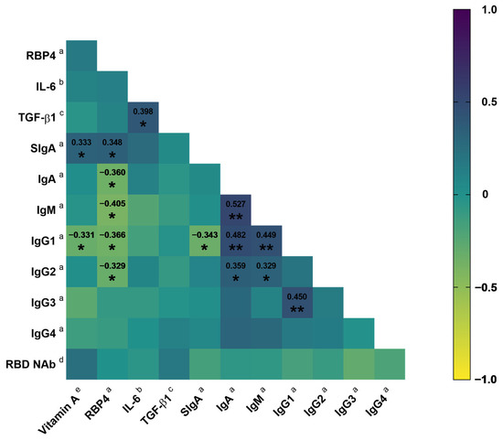 Correlation matrix between vitamin A intake and RBP4 with the antibody concentration in COVID-19 outpatients. Spearman correlation coefficient. * p < 0.05; ** p < 0.01. a μg/mL; b pg/mL; c ng/mL; d %; e μg RAE. Abbreviations: RBP4, retinol-binding protein 4; IL-6, interleukin 6; TGF-β1, transforming growth factor beta 1; Ig, immunoglobulin; RBD NAb, receptor-binding domain neutralizing antibodies.