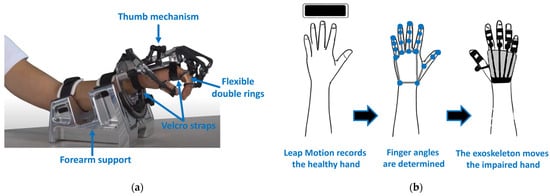 Overview of the RobHand system: (a) The exoskeleton is secured to the hand through flexible double rings and Velcro straps, with the thumb correctly positioned using the designated mechanism. The exoskeleton is affixed to the forearm support; (b) Illustration depicting the operation of bilateral therapies based on the Leap Motion. The Leap Motion provides directional vectors of the hand’s digits, facilitating the determination of finger angles to precisely control the movement of the hand exoskeleton.