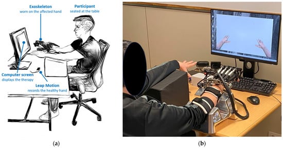 Study setup: (a) The participant was seated at the table in front of the computer screen. The participant was wearing the hand exoskeleton on the affected hand, while the Leap Motion recorded the healthy hand; (b) A patient with right-side impairment engaged in bilateral hand-opening and -closing exercises.