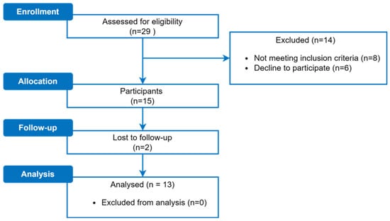 A total of 29 participants were recruited from medical records at the Hospital Benito Menni. Of this initial cohort, 8 were excluded after further review and 6 declined to participate due to a lack of time or interest, resulting in 15 participants who entered the study and completed personal interviews and initial assessments. However, two of them did not complete the follow-up evaluations due to unrelated clinical complications. Thus, a total of 13 participants successfully completed the study and were included in the analysis (Figure 3).