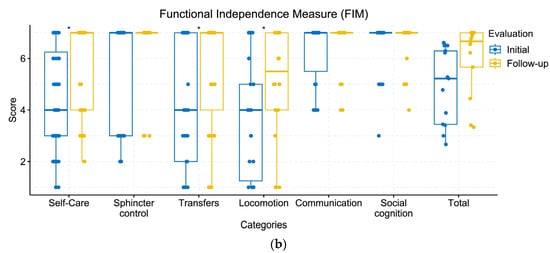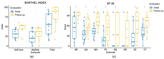 The results obtained from the assessments using the BI, FIM, and SF-36 instruments at the initial and follow-up evaluations are depicted in Figure 4. For the BI (Figure 4a), no statistically significant differences were observed in the overall score (t = −2.0505; p-value = 0.0514). Although a significant improvement was noted in the self-care sub-index (t = −2.8295; p-value = 0.0093), no such improvement was observed in the mobility sub-index (t = −1.3841; p-value = 0.1793). Concerning the FIM (Figure 4b), no significant differences were found in the total score (t = −1.9450; p-value = 0.0636). However, a detailed examination of individual items revealed a significant improvement in several aspects, including self-care (t = −5.5095; p-value < 0.0001), transfers (t = −2.8613; p-value = 0.0054), and locomotion (t = −2.2095; p-value = 0.0318). No statistically significant differences were observed in other items: sphincter control (t = −1.9890; p-value = 0.0528), communication (t = −0.4981; p-value = 0.6206), and social cognition (t = −0.5288; p-value = 0.5985). The SF-36 questionnaire (Figure 4c) revealed significant differences between the initial and follow-up evaluations in the domains of bodily pain (t = −3.6703; p-value = 0.0022), general health (t = −2.3381; p-value = 0.0281), mental health (t = −3.3018; p-value = 0.0030), physical functioning (t = −2.2575; p-value = 0.0339), role-emotional (t = −2.6363; p-value = 0.0161), social functioning (t = −3.1250; p-value = 0.0049), and vitality (t = −3.0302; p-value = 0.0059). The only item that did not exhibit a significant improvement was the role-physical (t = −1.8680; p-value = 0.0763).