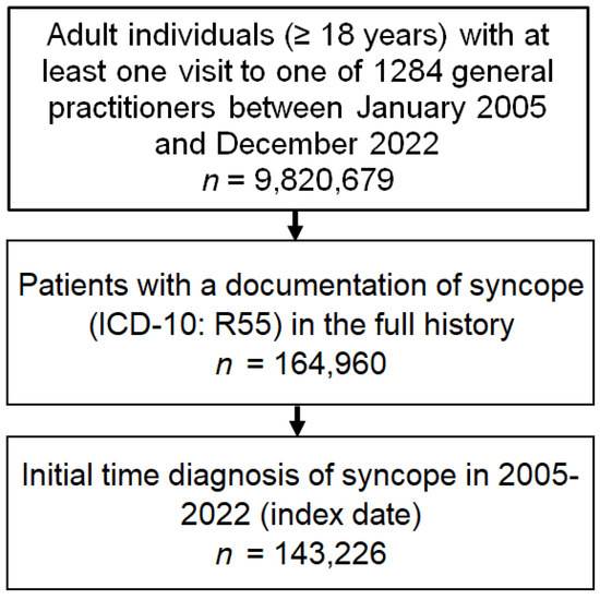 This retrospective cross-sectional study included adults with first-time syncope diagnosis (ICD-10 code: R55) in 1 of 1284 general practices in Germany between 2005 and 2022 (index date) (Figure 1).