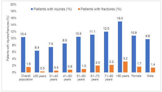 Patients with injuries were older than patients without injuries (63.0 vs. 56.5 years, p < 0.001), and the proportion of women was slightly higher in the injury group (59.2% vs. 56.6%). Patients with fractures were much older than patients without fractures (70.9 vs. 56.9 years, p < 0.001), and the proportion of women was also higher in the former group (62.4% vs. 56.8%, p < 0.001). Due to the higher age, the proportions of comorbidities were also significantly higher among patients with injuries and fractures than among patients without fractures or injuries (Table 2).