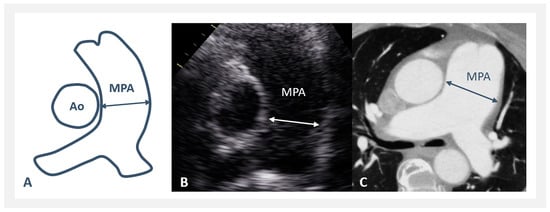 - Sheikhzadeh, S.; De Backer, J.; Gorgan, N.R.; Rybczynski, M.; Hillebrand, M.; Schüler, H.; Bernhardt, A.M.; Koschyk, D.; Bannas, P.; Keyser, B.; et al. The main pulmonary artery in adults: A controlled multicenter study with assessment of echocardiographic reference values, and the frequency of dilatation and aneurysm in Marfan syndrome. Orphanet J. Rare Dis. 2014, 9, 203–212. [Google Scholar] [CrossRef]