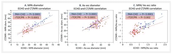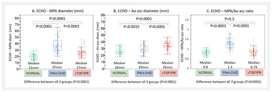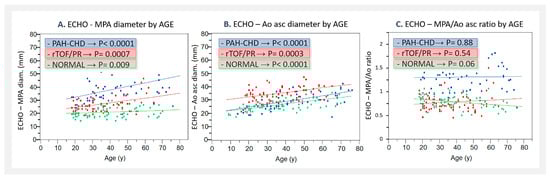 - The MPA/Ao asc diameter ratio was significantly greater in PAH-CHD (0.68–2.3, median 1.3), but not in rTOF/PR (0.46–1.52, median 0.74), compared to NORMAL (0.52–1.09, median 0.8)—Figure 2C. MPA/Ao asc ratio did not show statistically significant changes with age in all 3 patients’ groups, as shown in Figure 3C.