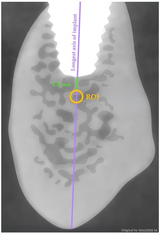 The data extraction was processed, and the values quantified by Horos TM® software 3.3.6 (Horos Project, Brooklyn, NY, USA). The acquisition volume was processed while respecting the orthogonal axes of the implants, reconstructing images 1 mm thick and 1 mm spacing sagittally to the longest axis of the implant, obtaining V-L view images of the implant to be studied. We applied a region of interest (ROI) dimension of 1 mm for the entire cancellous bone within the same view 1 mm apical to the longest axis of the implants placed through osseodensification and the conventional technique while taking into consideration an implant apex distance of at least 2 mm for the mandibular canal, mental foramen, nasal cavity, and floor and wall of the maxillary sinus (Figure 1). This ROI selection was undertaken taking into consideration that the smaller the ROI, the higher the spatial resolution, and to avoid proximity with corticalized bone. The bone mineral density was analyzed within the internal area of the ROI and expressed in density value (DV).