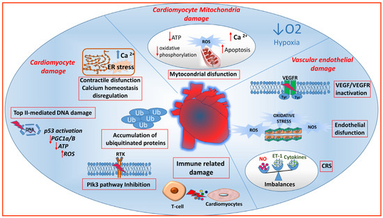 Molecular mechanisms of anticancer drug-mediated cardio-vascular toxicity. Chemotherapeutic agents and targeted treatments can induce cardiovascular toxicity by affecting both endothelial cells and cardiomyocytes. In vascular endothelial cells, the inhibition of the VEGF pathway can result in hypertension, altered vascular permeability, bleeding, and thrombosis. In endothelial cells, oxygen reactive species (ROS) can disrupt the equilibrium between vasoconstricting agents, including endothelin (ET-1), and vasodilating agents such as nitric oxide (NO) produced by nitric oxide synthase (NOS). In the cytokine release syndrome (CRS), vasoactive soluble factors cause vasodilation and hypotension. The impact of antineoplastic drugs on cardiomyocytes may interest the mitochondria and could be linked to hypoxia resulting from vascular damage or to a direct influence of the drugs on the mitochondria, especially on the respiratory chain. This can result in ATP depletion, heightened ROS, calcium ion release (Ca2+), and apoptosis. Additionally, drugs can induce damage to cardiomyocytes by causing endoplasmic reticulum (ER) stress, DNA damage due to topoisomerase 2β (Top II) inhibition, accumulation of ubiquitinated (Ub) proteins, and interference with intracellular pathways, including PI3K, through receptor tyrosine kinase (RTK) inhibition. Top II caused cardiomyocyte death by p53 activation leading to ROS generation and reduction of ATP and peroxisome proliferator–activated receptor-γ coactivator 1-α and 1-β (PGC1α/β). Furthermore, immune checkpoint inhibitors can stimulate T-lymphocytes to recognize self-antigens, leading to myocarditis.