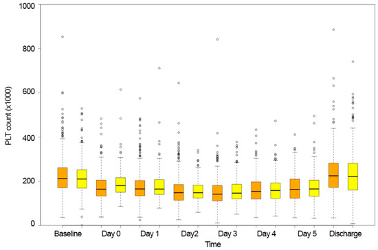 Pre-operative platelet count was >150.000/µL in all patients, as per inclusion criteria. A mixed regression model for repeated-measure analysis showed that the post-procedural platelet count changed according to a parabolic curve in all patients (estimate = −0.931, standard error = 0.421, p = 0.027, Figure 1).