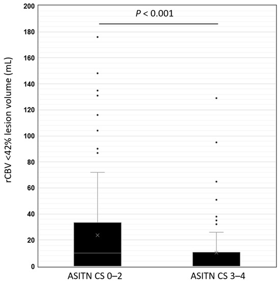 Box and whisker plot distribution of rCBV < 42% lesion volume in patients with a poor DSA ASITN CS of 0–2 and a robust DSA ASITN CS of 3–4. Box plot represents median and interquartile range, whereas whiskers represent minimum and maximum values.