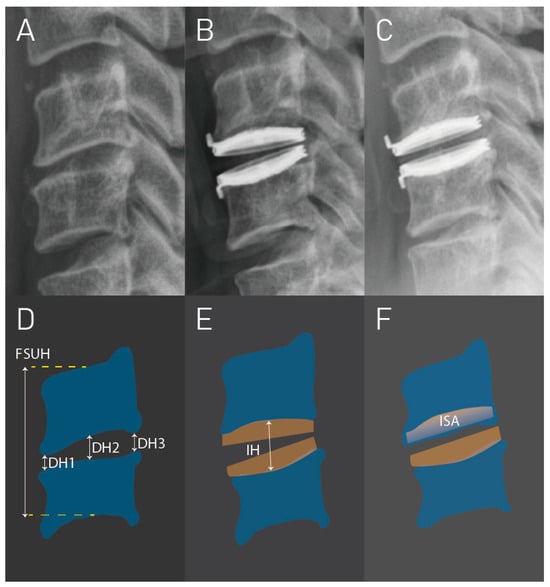 Grade 1 subsidence in a case that underwent C5–C6 cervical disc arthroplasty (CDA). (A–C) are the cervical radiographs before surgery, immediately after surgery, and at 1 year follow-up, respectively. (D–F), respectively, represent the schematic diagrams for radiographs (A–C). DH1 = anterior disc height; DH2 = middle disc height; DH3 = posterior disc height; FSUH = functional spinal unit height; IH = implant height; ISA = implant subsidence area.