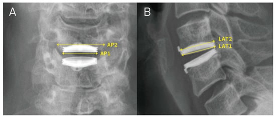 Illustration of measuring AP1, AP2, LAT1, LAT2. (A,B) represent the anteroposterior (AP) view and lateral (LAT) view of the post-operative radiographs, respectively. AP1 = the width of the Bryan Disc; AP2 = the width of the adjacent endplate; LAT1 = the length of the Bryan Disc; LAT2 = the length of the adjacent endplate.