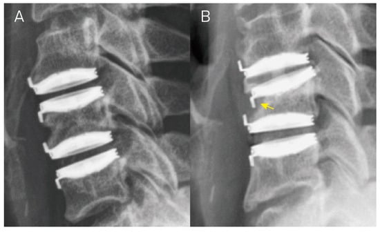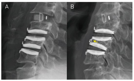A hybrid case underwent anterior cervical discectomy and fusion at C3–C4 and cervical disc arthroplasty at levels C4–C5 and C5–C6. Panels (A,B) illustrate the lateral view of radiographs taken right after the operation and at a 1-year follow up, respectively. In Panel (B), there is an evident functional spinal unit height decrease > 5 mm at the C4–C5 and C5–C6 levels, accompanied by C5 vertebral collapse, resulting in Grade 3 subsidence in both segments (yellow arrow).