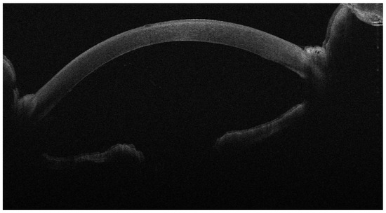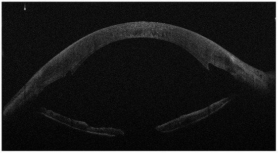 At day 1 and 12 post operation, graft adherence to the host stromal bed was monitored by slit-lamp examination as well as by anterior segment optical coherence tomography (Anterior Segment OCT MS-39, Phoenix ver 4, CSO srl, Scandicci (Florence) Italy) (Figure 1 and Figure 2). If the graft was detached, defined by the presence of fluid between the recipient and donor cornea at any position of the cornea involving at least the 50% of the lenticule, it was immediately recovered under topical anesthesia by air bubble injection in the anterior chamber through the same clear corneal incision of the primary approach to relocate the donor lenticule to the stromal bed (Air Rebubbling—ARB) (Figure 3 and Figure 4). The main outcome was the occurrence of GD, treated with ARB. For each patient, we considered gender, age, period of corneal decompensation, pseudophakia, concomitant ocular pathologies, keratometry (steep axis and average keratometry), pachymetry, and combined lens phacoemulsification. Considering the data received with donors’ tissues, we also analyzed data about thickness, endothelial cell density, the diameter of the donor lenticule, the donor’s gender and age, their cause of death, and the time span between death and corneal explanation. Detailed features of patients and donors’ tissues are listed in in the tables. We adopted a vast and meticulous analysis of donors’ and receivers’ characteristics to investigate all the possible aspects that could influence GD, offering a detailed list of the examined parameters. Data were analyzed by a one-way ANOVA with Tukey’s post hoc test (p < 0.05) and a Chi-square test with an Odds Ratio calculation using GraphPad InStat3 (ver 3.06, GraphPad Software Inc. San Diego, CA, USA).