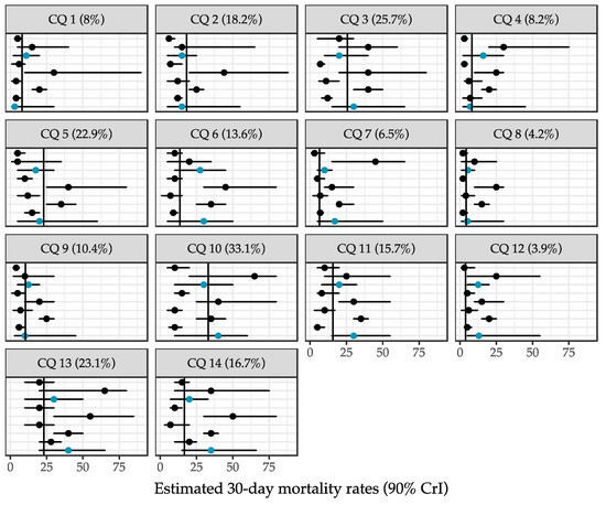 Overview of participants’ responses to the 14 calibration questions. The dots represent participants’ best estimates of the 30-day mortality rates and the horizontal bars represent their 90% credible intervals. The true 30-day mortality rate is reported in parentheses and depicted by the vertical line. Participants with calibration scores above 0.05 are highlighted in blue.