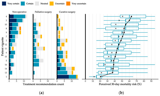 Distribution of participants’ responses to the 16 vignettes. Vignettes were sorted in descending order of mean 30-day mortality risk. (a) Overview of recommended treatments per vignette, subcategorised by participants’ confidence in the optimality of the elected treatment. (b) Boxplots of the estimated 30-day mortality risks per vignette. Circles denote the mean probabilities (equal weights) and crosses denote the performance-weighted pooled estimates.