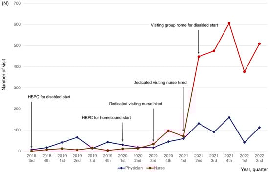 Patient characteristics and medical services provided were compared according to the service type. Categorical variables are presented as counts and proportions. Continuous variables are presented as medians and interquartile ranges (IQRs). The numbers of visits by physicians and nurses per quarter are presented in a graph.