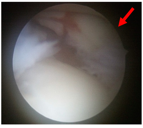 An avulsed Wagstaffe tubercle fracture (red arrow) is observed on arthroscopy.