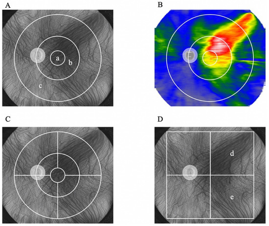 To compare the central and peripheral choroidal thicknesses, we set a grid consisting of three circles with diameters of 3, 9, and 18 mm, centered on the fovea. Three subfields were set up in this study as follows: (a) <3 mm, (b) <9 mm, and (c) 9–18 mm (Figure 1A,B). Furthermore, to examine changes in choroidal thickness before and after treatment in detail, we divided the 3–9 mm subfield and the 9–18 mm subfield into the following four quadrants: supratemporal, infratemporal, supranasal, and infranasal (Figure 1C).