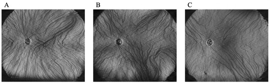 Symmetrical and asymmetrical patterns of deep choroidal veins and the vortex vein in en-face images. Representative cases from each of the following three groups: upper dominant (A), lower dominant (B), and asymmetrical (C).
