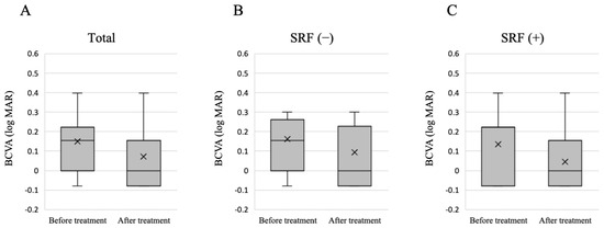 Changes in BCVA before and 3 months after treatment. (A) Changes in BCVA in all 16 eyes. The mean BCVA significantly improved after the treatment (p = 0.02, Wilcoxon signed rank test). (B) Changes in BCVA in nine eyes with no SRF at 3 months after treatment. No significant difference in BCVA was observed before and after treatment (p = 0.07). (C) Changes in BCVA in seven eyes with SRF at 3 months after treatment. No significant difference in BCVA was observed before and after treatment (p = 0.09). The cross symbol represents the mean marker. BCVA: best-corrected visual acuity; SRF: subretinal fluid; logMAR: logarithm of the minimum angle of resolution.