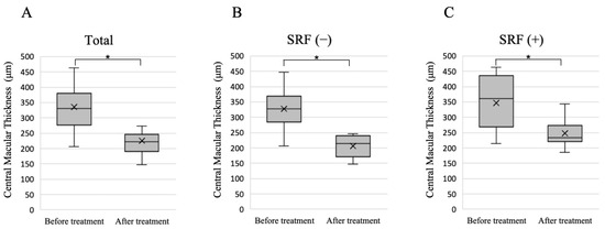 Changes in central macular thickness before treatment and 3 months after treatment. (A) Changes in central macular thickness in all 16 eyes. (B) Changes in central macular thickness in nine eyes with no SRF 3 months after treatment. (C) Changes in central macular thickness in seven eyes with SRF 3 months after treatment. Significant differences in central macular thickness were observed before and after treatment in all groups. The cross symbol represents the mean marker. * p < 0.001, Wilcoxon signed-rank test. SRF: subretinal fluid.
