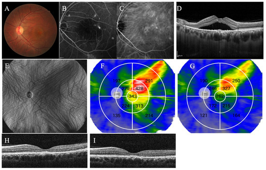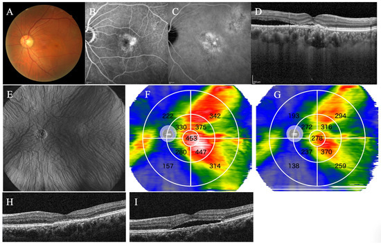 Representative case 2. A 55-year-old male with PNV treated with half-fluence photodynamic therapy combined with intravitreal aflibercept injection. The fundus photograph (A), the fluorescein angiography (B), and the indocyanine-green angiography before treatment (C). (D) Type 1 MNV and SRF exist in the macula. (E) The en-face image before treatment showed overall dilated choroidal blood vessels. (F) In the choroidal thickness map before treatment, the 3–9 and 9–18 mm subfields were divided into four subfields. In the choroidal thickness map, the choroid is displayed in the order of thinness as blue, green, yellow, red, and white. The value of each subfield indicates the mean choroidal thickness (μm) for the subfield, and the average choroidal thickness in each subfield was automatically measured. (G) The choroidal thickness map 3 months after treatment shows an overall choroid thinner than in (F). The SRF that existed before treatment disappeared 1 month after treatment (H) but recurred 3 months after treatment (I).
