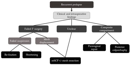 Sacrocolpopexy (SCP) is the gold standard treatment option for the surgical management of apical and multicompartment pelvic organ prolapse (POP) [1,2], with high subjective and objective success rates in the short and long term [3,4,5,6,7]. Despite the low recurrence rate, there are women presenting with bothering recurrent POP after SCP, requiring further surgical intervention [8,9,10]. More urogynecologists will be asked to manage this challenging situation since future prolapse surgery is not only performed in older women and patients want to preserve their quality of life up until old age [11]. After searching the PubMed and Cochrane libraries, we discovered that there are no systematic reviews on how to systematically approach recurrent POP surgically after failed SCP. The limited data [12,13,14,15] mostly recommend a complete repeat sacrocolpopexy, assuming the redo procedure tackles the primary shortfalls and weaknesses. Disregarding the few weaknesses of sacrocolpopexy to correct concomitant pathologies without severe complication risks. Therefore, we presented our decision process based on the outcome data of primary cases, supposing equivalent performance in repeat SCP.