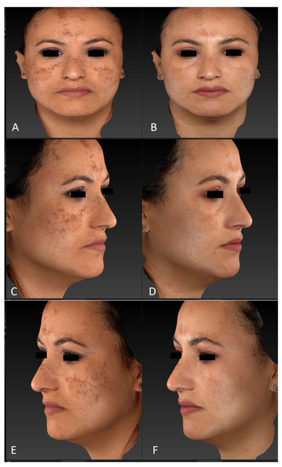 Diffuse hypermelanoses on a female patient’s face area (cheeks, forehead, and nose) before treatment (frontal view, (A); right lateral view, (C); left lateral view, (E)) and three months after the last laser treatment session (frontal view, (B); right lateral view, (D); left lateral view, (F)). Images acquired with a Vectra H2 3D imaging System.