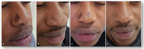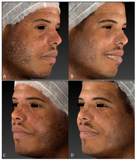 Facial hypermelanoses in a male patient before treatment (right lateral view, (A); left lateral view, (C)) and three months after the last laser treatment session (right lateral view, (B); left lateral view, (D)). Images acquired with a Vectra H2 3D imaging System.