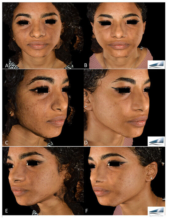 Diffuse Hypermelanoses on a female patient’s face area before treatment (frontal view, A; right lateral view, C; left lateral view, E) and three months after the last laser treatment session (frontal view, B; right lateral view, D; left lateral view, F). Images acquired with a Quantificare 3D imaging System.