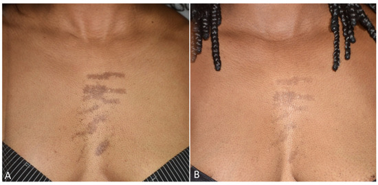 Images of linear hypermelanoses on a female patient’s breast before (A) and three months after the last laser treatment session (B). A visible clearance of pigmented lesions was observed.