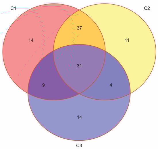 The overlap rates among the eligible patients for treatment with GLP-1ra or SGLT2inh. The unpublished results from our research that is cited in refs. [32,33] (N = 170, F:M = 95:75, age 50–89 years, median 66). The simplified criteria for prescribing GLP-1ra or SGLT2inh: C1: Atherosclerotic CVD (Coronary artery disease, Periphery artery disease or Cerebrovascular disease); C2: Age ≥ 55 years + chronic heart disease; C3: estimated glomerular filtration rate ((eGFR) < 60 mL/min).