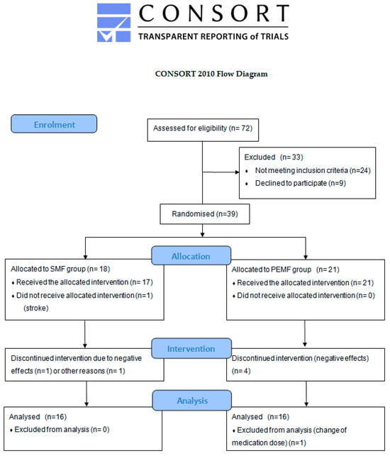 The initial stage of this study took into account 72 patients with diagnosed RA; in this group, 24 individuals did not meet the inclusion criteria and 9 refused to participate. The remaining 39 patients were randomly divided into two groups: 18 patients were assigned to the group treated with a static magnetic field (SMF group) and 21 to the group receiving low-frequency pulsed electromagnetic field therapy (PEMF group). Ultimately, this study took into account 32 participants. A detailed flow diagram is shown in Figure 1.