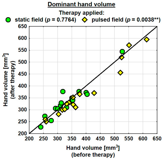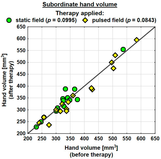 Following the therapy, the volume of the dominant hand decreased in the entire study group (by 0.9 mm3 on average) and the change was statistically significant. The probability value determined using the Wilcoxon test was p = 0.0230 *. In the SMF group, there was a decrease in the hand volume (on average by 0.3 mm3); however, the change was not statistically significant. Conversely, in the PEMF group, the hand volume decreased by as much as 19.5 mm3 on average and the change was statistically significant. The probability value determined using the Wilcoxon test was p = 0.0038 ** (Table 4). Following the therapy, the entire study group showed a decrease in the volume of the subordinate hand (by 2.3 mm3 on average). The change was not statistically significant. In the SMF group, there was a decrease in the hand volume (by 8.1 mm3 on average); however, the change was not statistically significant. In the PEMF group, the hand volume decreased by 12.1 mm3 on average and the change was not statistically significant either. Nevertheless, the probability value determined using the Wilcoxon test reflected a trend towards significance and amounted to p = 0.0843 (Table 4).