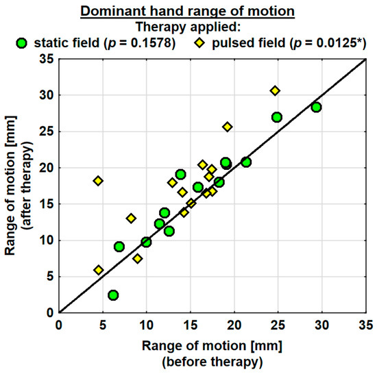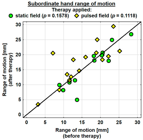 The present findings also show that the ranges of motion in the joints of both the dominant and the subordinate hand were improved in the entire study group; however, the effect was better in the PEMF group. The lack of higher improvement in the range of motion in the subordinate hand in the entire group may have been linked to the fact that the subordinate hand was less engaged in the activities of daily living and self-care. A similar study was conducted by Stolarzewicz and Szczuka, who reported an improved range of motion in the knee following both SM and EM therapies [66].