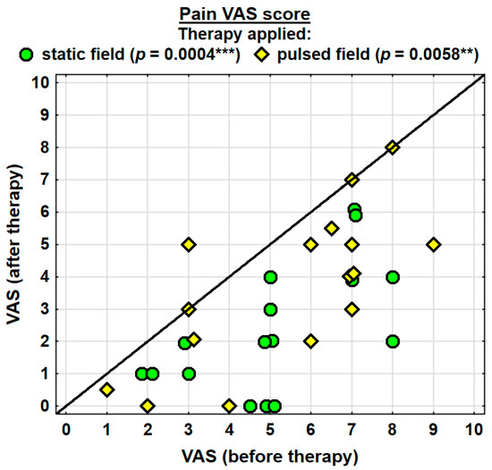Changes in the pain VAS score. Statistically significant values: **—p < 0.01, ***—p < 0.001.