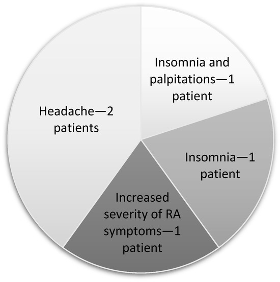 In the entire group of patients that received the therapy, five individuals experienced adverse effects. These patients were not included in the final analyses. The adverse effects are shown in Figure 7.