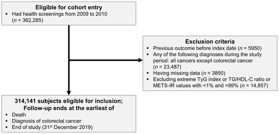 We analyzed a cohort of 362,285 Korean adults aged over 40 years who participated in the NHSP from 2009 to 2010 by utilizing data from the NHIS-HealS database. From this cohort, we excluded 5950 individuals with CRC before the index date and 23,487 individuals who were diagnosed with cancers other than CRC during the follow-up period. Furthermore, we excluded 3850 individuals with missing data and 14,857 individuals with TyG index, TG/HDL-C ratio, or METS-IR values below the 1st or above the 99th percentile. Therefore, 314,141 individuals were included in the analysis. The follow-up period was extended until 31 December 2019 and ended earlier in the event of death or CRC diagnosis (Figure 1).