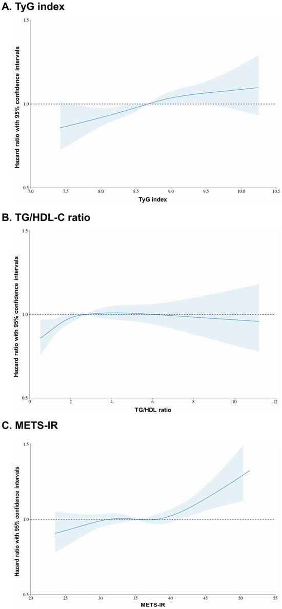Figure 3 presents a restricted cubic spline, a mathematical function employed to model nonlinear relationships between a continuous predictor variable and an outcome variable, such as the adjusted HRs with 95% CIs. The solid line represents the HR, and the blue area represents the 95% CIs. For TyG index values ≥ 8.67, the HR value increased to values > 1, and for values ≥ 9.05, all 95% CI values exceeded 1. However, for TG/HDL-C ratio values ≥ 2.73, the HR exceeded 1, but there were no values for which all CIs exceeded 1. For METS-IR values ≥ 35.3, the HR exceeded 1, and for values ≥ 41.2, all 95% CIs exceeded 1. An analysis of the overall graph using the restricted cubic spline method showed a nonlinear, positive dose–response association between the TyG index and the METS-IR in relation to the incidence of CRC, while the relationship for the TG/HDL-C ratio was less clear.