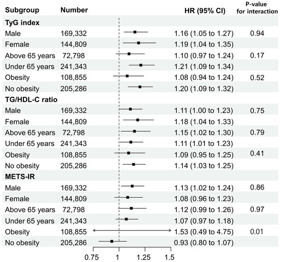 Second, this study used a large dataset to conduct subgroup analyses that included factors such as sex, age, and obesity status. Additionally, analyses were performed based on the location of the cancer. In the subgroup analyses of the TyG index and TG/HDL-C ratio, which were found to be statistically significant in the adjusted model of the Cox proportional hazard analysis, there were no differences between the groups in their associations with CRC based on sex, age, or obesity status. In the subgroup analyses of the METS-IR, statistical significance was observed between the obese and non-obese groups, while in the other groups excluding this, there was no statistical significance, similar to other markers.