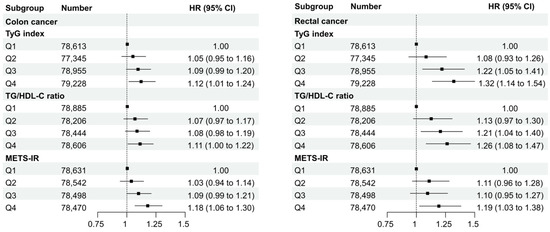 Figure 4 and Figure 5 display the HRs of the TyG index, TG/HDL-C ratio, and METS-IR values in Q4 compared with Q1 for subgroups based on sex, age (<65 and ≥65 years), obesity status, and cancer site (colon and rectal cancers). In the TyG index and TG/HDL-C ratio, associations according to sex, age, or obesity status did not differ significantly. However, in the METS-IR, a statistically significant association was observed in the obese group compared to the non-obese group (p-value for interaction = 0.01). Based on the location of cancer, this study divided the cases into colon and rectal cancers and compared the TyG index, TG/HDL-C ratio, and METS-IR by quantile in both cancer types. As a result, in colon cancer, Q4 of the TyG index showed a statistically significant HR of 1.12 (95% CI: 1.01–1.24), Q4 of the TG/HDL-C ratio displayed an HR of 1.11 (95% CI: 1.00–1.22), and Q4 of METS-IR was significantly associated with an HR of 1.18 (95% CI: 1.06–1.30). In rectal cancer, Q3 and Q4 of the TyG index exhibited statistically significant HRs of 1.22 (95% CI: 1.05–1.41) and 1.32 (95% CI: 1.14–1.54), respectively. Q3 and Q4 of the TG/HDL-C ratio showed statistically significant HRs of 1.21 (95% CI: 1.04–1.40) and 1.11 (95% CI: 1.08–1.47), respectively, while the METS-IR was statistically significant only in Q4 with an HR of 1.19 (95% CI: 1.03–1.38).