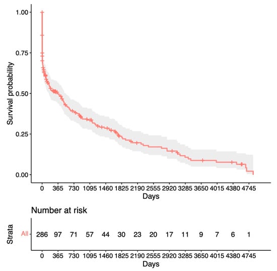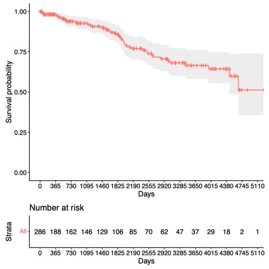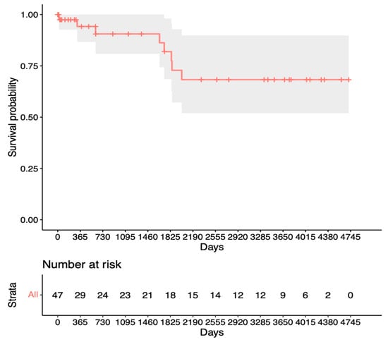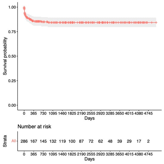 Our analysis for revision surgery in Figure 2 shows a steep decline within the first year after trabeculectomy before remaining relatively stable at 80%. In contrast, the analysis for repeat surgery in Figure 3 shows only a slight decrease to 95% after the first year, with a steady decline thereafter. This suggests a preference for revision over repeat surgery within the first year after trabeculectomy. Notably, King et al.’s study aligns with our findings, highlighting that revision/bleb intervention proves to be a safe procedure and is mostly performed within the first 5 months after surgery []. The proportion of patients requiring revision also appears to be significantly lower in our study. Other studies have mentioned repeat surgery as a viable option for managing failed bleb filtration [,,]. Our Kaplan–Meier survival analysis for success after revision (Figure 4) shows slightly lower survival rates than the initial trabeculectomy group (Figure 3). This could potentially be explained by increased scar tissue development after revision.